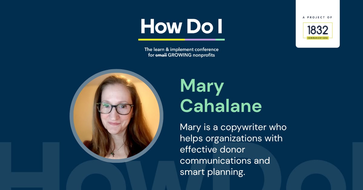 I recently announced the How Do I online conference in January- the conference for staff at GROWING nonprofits (budget below $5 million). I’m using this section to introduce you to one of the conference speakers, fundraising copywriting expert Mary Cahalane.